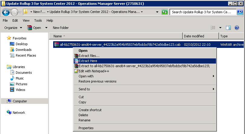 the CU3 packages for each SCOM role that you have deployed (e.g. Agent, Management Server, Web Console, Console etc.) to a location on your SCOM 2012 Management Server: