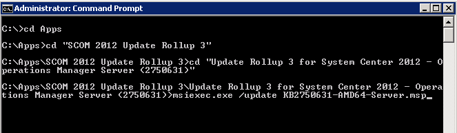 all-kb2750631-amd64-reporting_8043cc39d79514d1e633b645063100c136cf1f92.cabNow, open up a Command Prompt with Administrative permissions and browse to the location on your SCOM 2012 Management Server that you extracted the Update Rollup 3 package to. Once here, you will need to execute the following command for each update package: