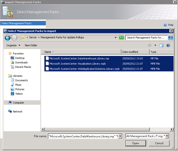 Now browse to the "C:\Program Files\System Center 2012\Operations Manager\Server\Management Packs for Update Rollups " folder and select the three new management packs to import as shown below
