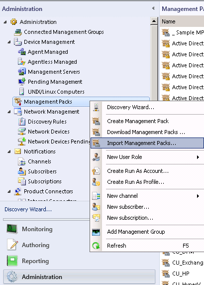 To import these management packs, simply open up the SCOM Console and click on the Administration button in the wunderbar from the bottom left hand side of the screen. From there, expand the Administration view, right mouse click on Management Packs and then select Import Management Packs from the resultant menu